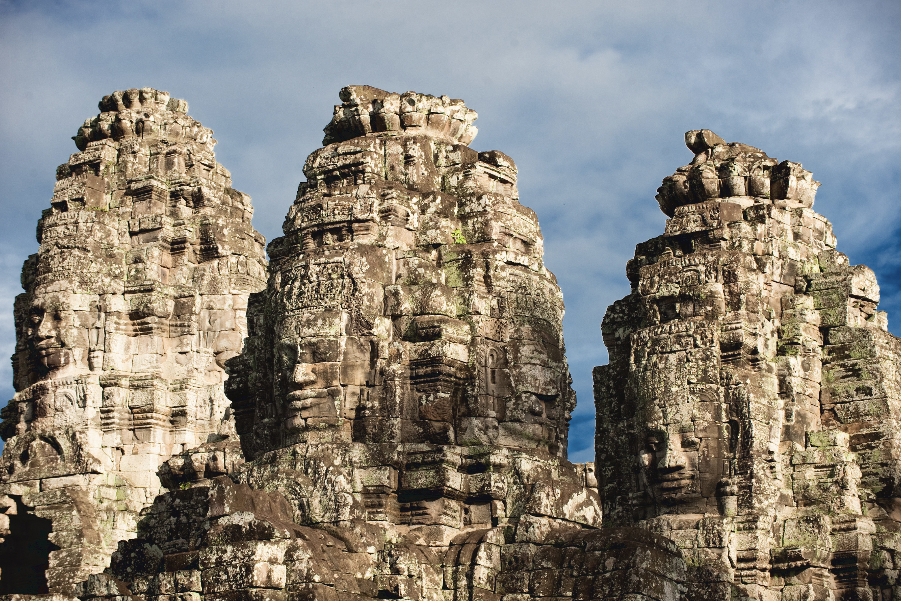 The Bayon, built in the centre of Angkor Thom about 1200 A.D., is the second most popular monument in Angkor, after Angkor Wa and was the state temple of King Jayavarman VII (1181- ca. 1218), who introduced Buddhism as the new state cult It is the temple with those numerous enigmatic "stone faces" Angkor is famous for. As it is not clear who or what is symbolized by those gigantic Buddhas, the remaining 37 towers of smiling faces of Angkor Thom have become an emblem of the mysteries of Angkor.