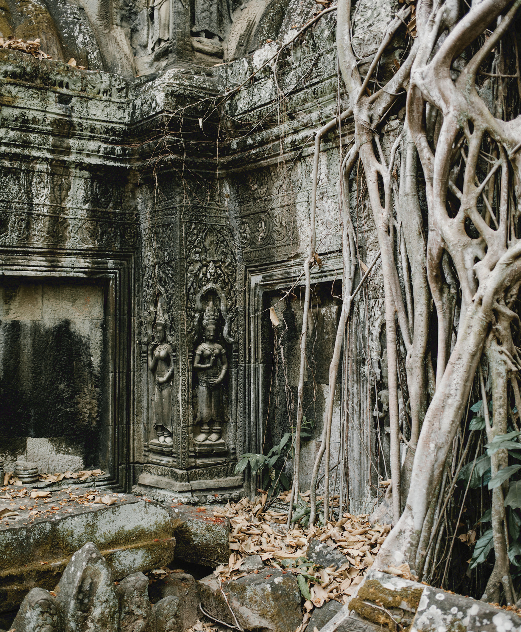 From here we return to our vehicle for the short transfer to the famed jungle temple of Ta Phrom - so called due to its present day enormous strangler figs (Ficus gibbosa) and even larger Thitpok trees (Tetrameles nudiflora) grown from the towers and hall. As with Preah Khan, we enter Ta Phrom from the far lesser visited northern gate and explore the site from there.