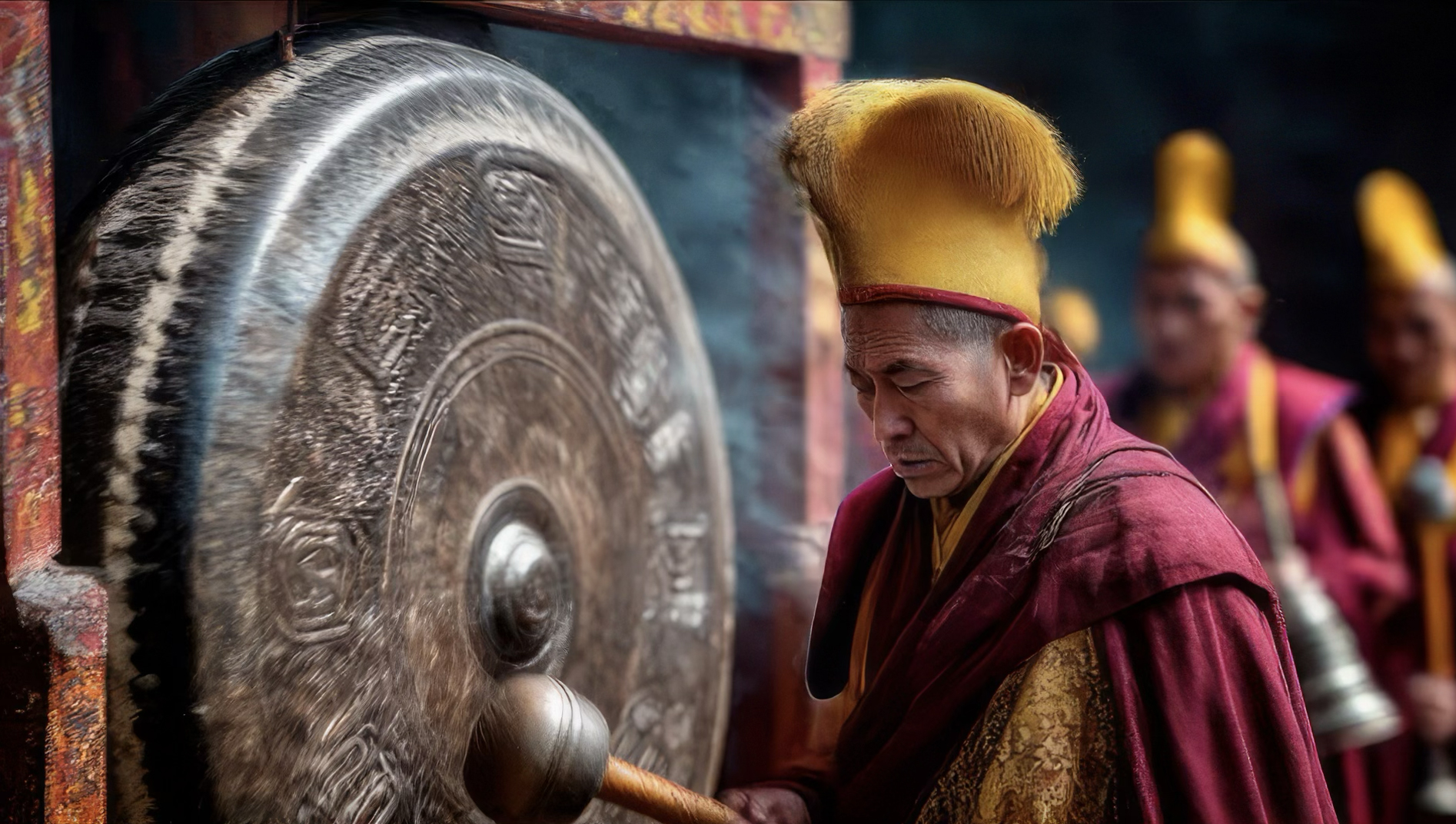 As we enter the Hall of Harmony and Peace, the sound rises first as a vibration — low, deep and resonant. Dozens of monks sit in long rows, their yellow and red robes flowing around them like folds of flame. Sutra books lie open before them, pages filled with curling Tibetan script. Their voices begin to unify, building into a chant that fills the hall — a sound that seems to pulse in the floor and echo across the carved beams above. Cymbals shimmer. Drums murmur steadily. It is less a performance than an embodied rhythm of faith, unfolding in real time.