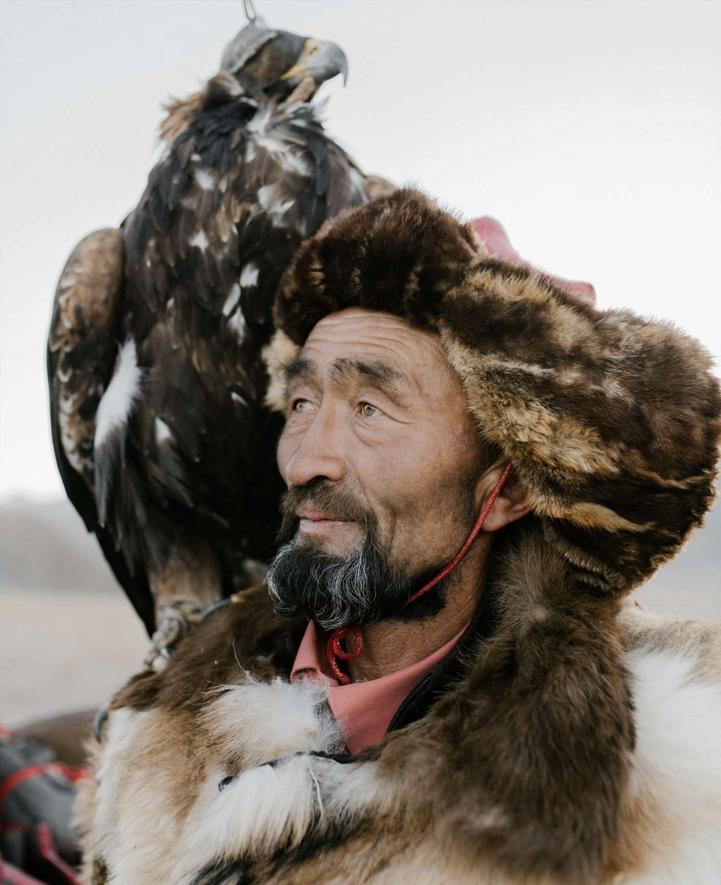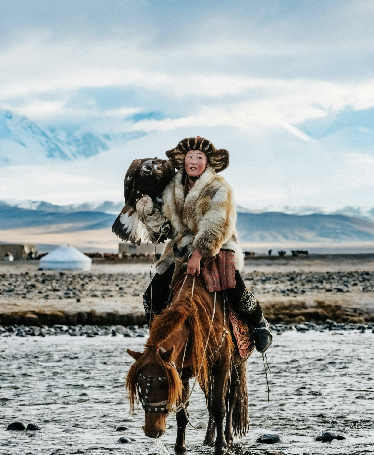 We may help collect fuel, prepare feed for animals or simply sit outside while elder family members sew or repair equipment. At some point the eagle is brought out once more, and we watch shorter training flights that reveal the constant conversation between handler and bird—silent cues, subtle movements, unwavering attention.