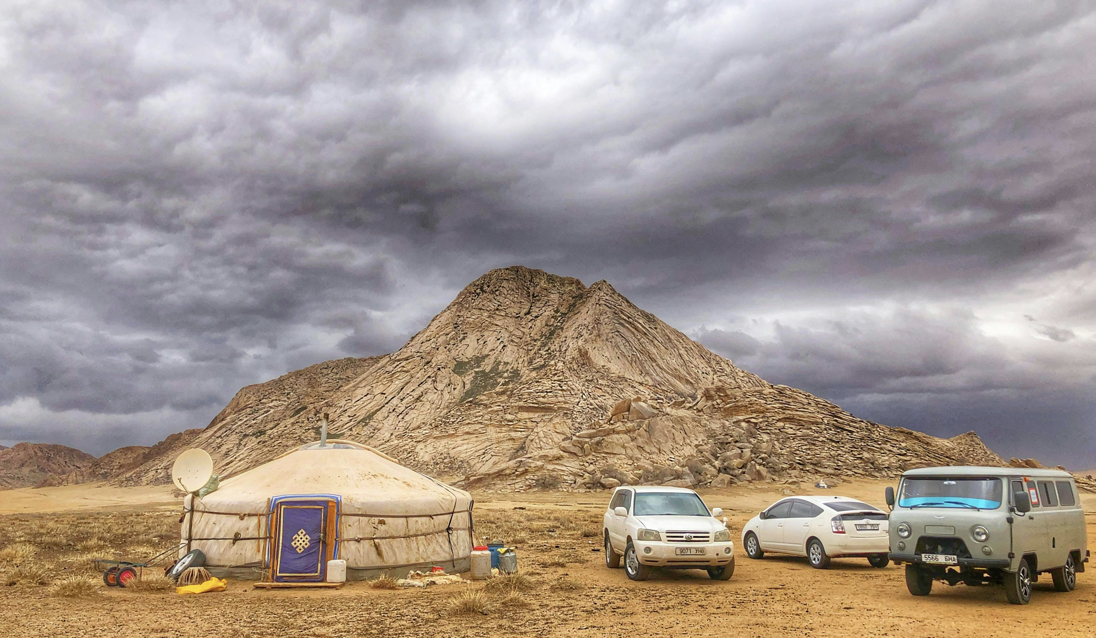As sunset approaches, the dunes turn amber and rose. We climb a ridge to watch shadows lengthen, and the cooling desert unfold beneath us. Dinner is cooked over an open flame, accompanied by traditional songs, laughter and the stillness of night falling. Stars begin to emerge one by one, reminding us that the sky here is as vast and unbounded as the land. Later, we gather around the fire to share stories, wrapped in the quiet peace of the steppe. Tomorrow, the sky will lift us.