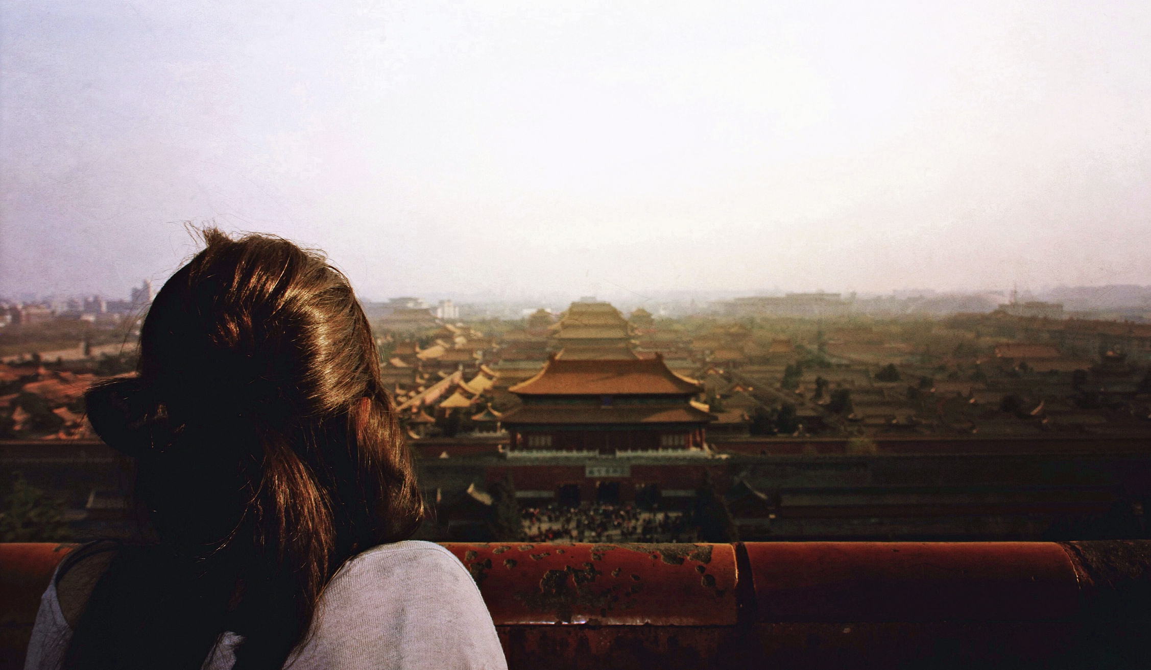With the broad sweep of Beijing before you, ascend Jingshan Park at sunrise — a peaceful stroll where pine needles scent the air and the ochre roofs of the Forbidden City unfurl below.