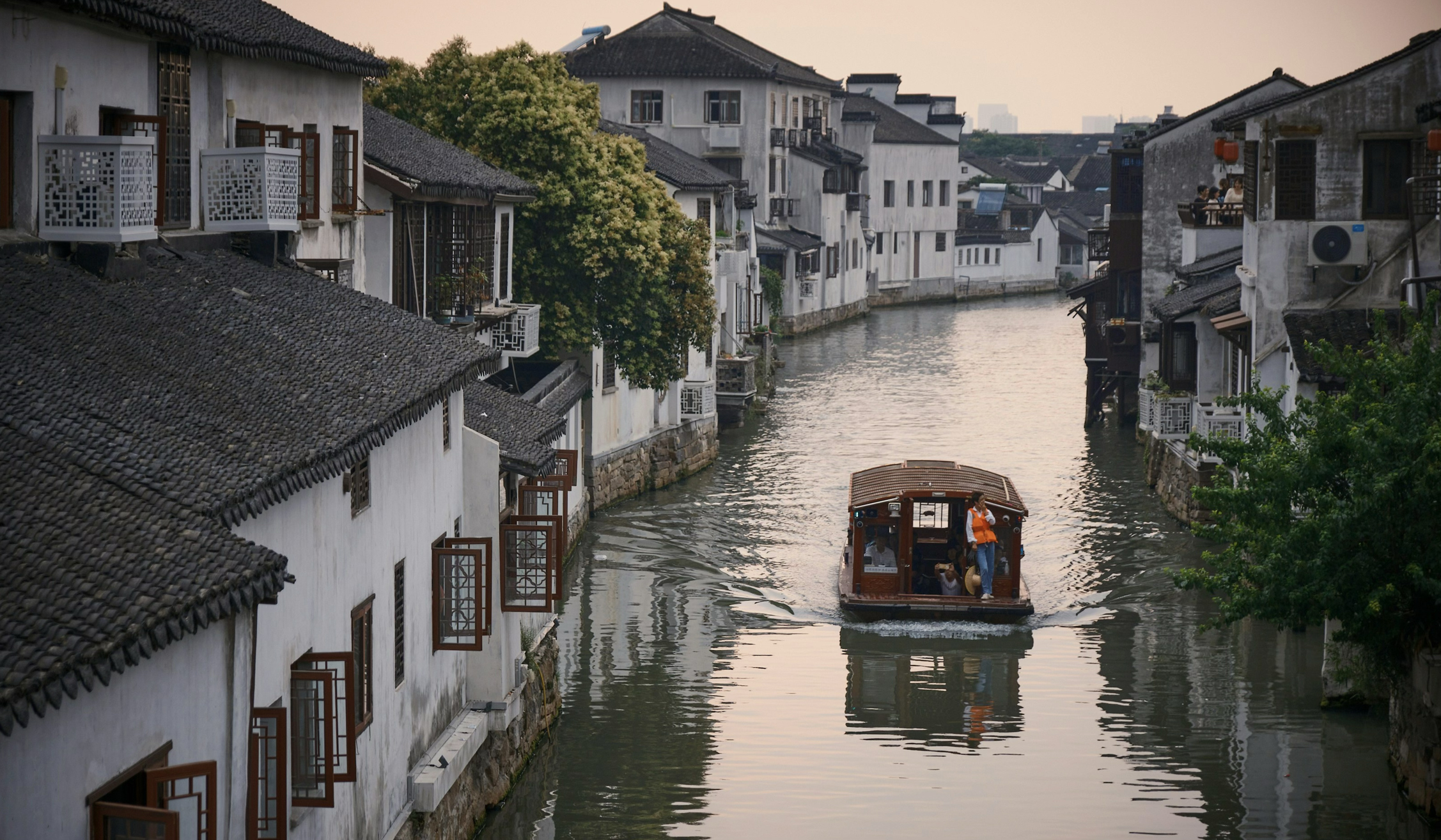 From the gardens, we continue to a historic canal district where whitewashed houses, stone bridges and narrow lanes line the waterfront. Life here unfolds quietly as residents sweep doorways, shopkeepers arrange displays and boats glide beneath arching bridges. A short boat ride may be taken for a waterside perspective of Suzhou’s traditional homes and small workshops.