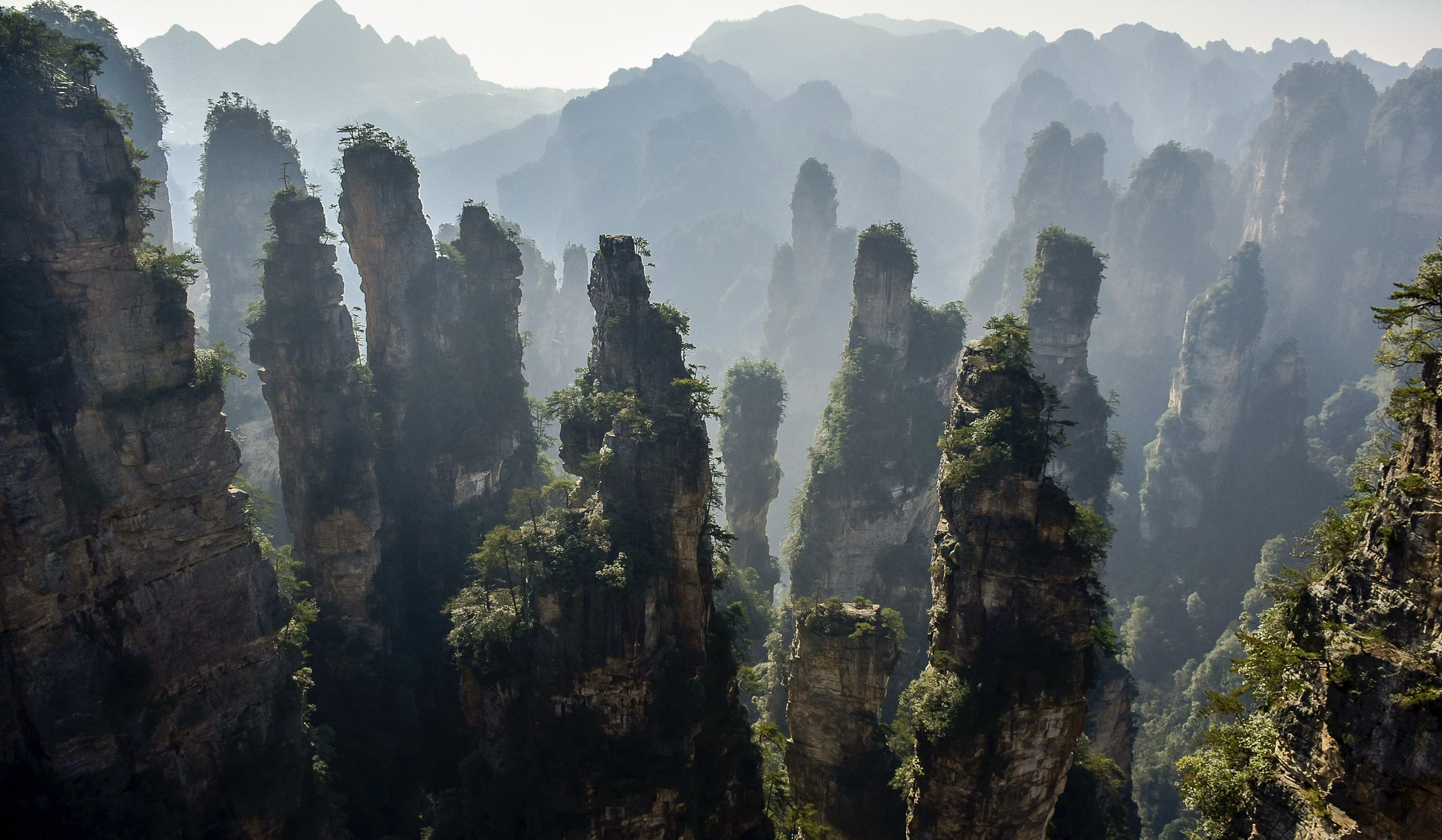 Our final full day in Zhangjiajie begins with the ascent on the Bailong Elevator, the towering glass lift that rises along the face of a cliff for more than three hundred metres. As we ascend, layers of sandstone peaks and deep ravines unfold below, offering an immediate sense of the dramatic world we are entering. At the upper station lies Yuanjiajie, a high plateau surrounded by towering pillars that rise in sculpted shapes. This area inspired the floating mountains seen in film, and the connection becomes clear as we walk between viewpoints where the pillars appear to hover in shifting mist.