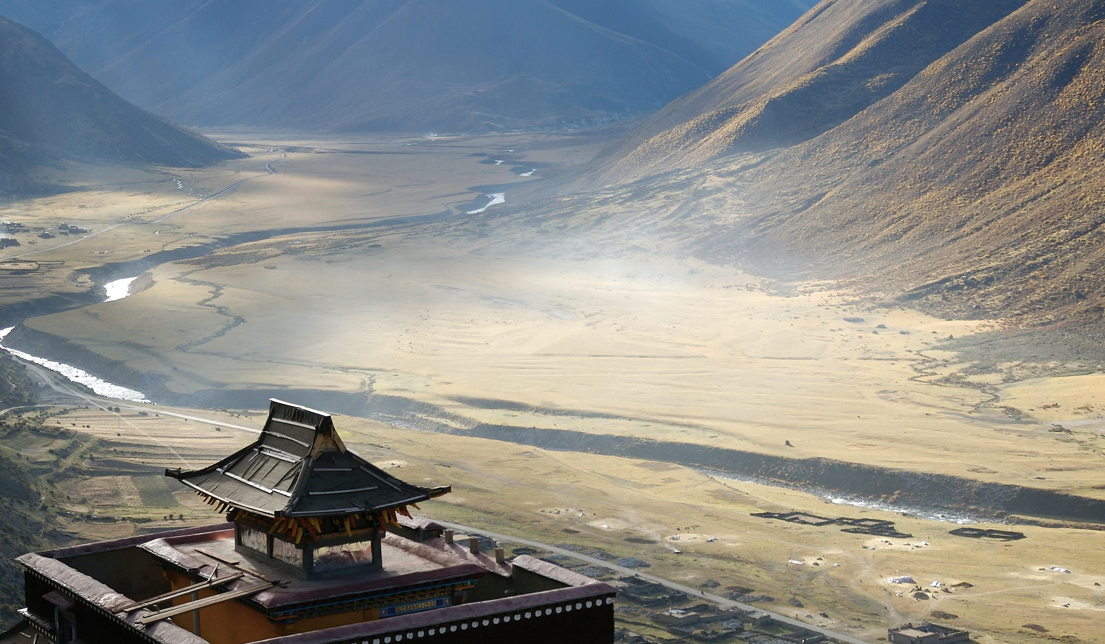 Grasslands stretch to the horizon, dotted with yaks, antelope, and perhaps nomads at rest by their tents — small human traces in a vast picture. The air grows thinner, the world quieter.